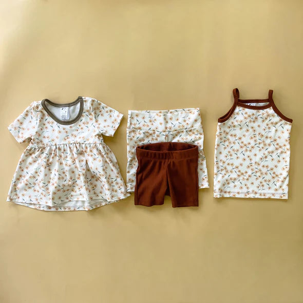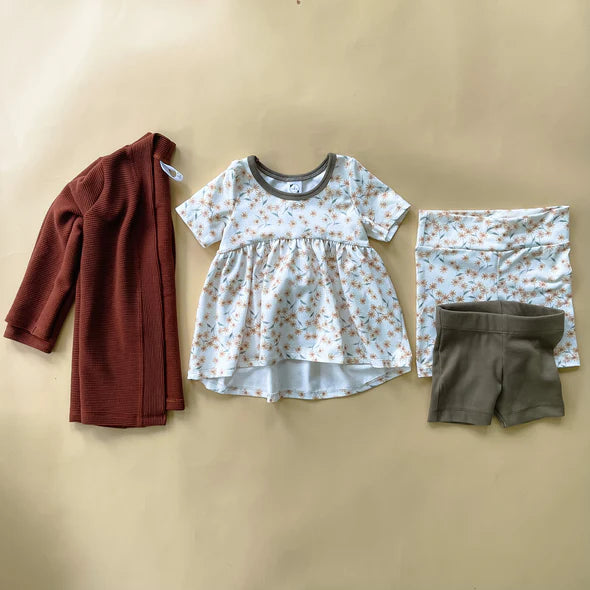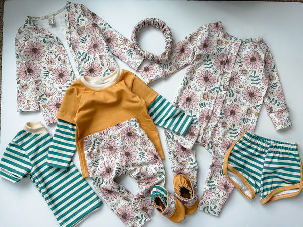 Each bundle is custom made in the size you request and thoughtfully created using high-quality organic fabrics. The prints and colors are a surprise, but every bundle is carefully curated so that all the pieces coordinate perfectly—giving you a small capsule wardrobe that works together seamlessly.
